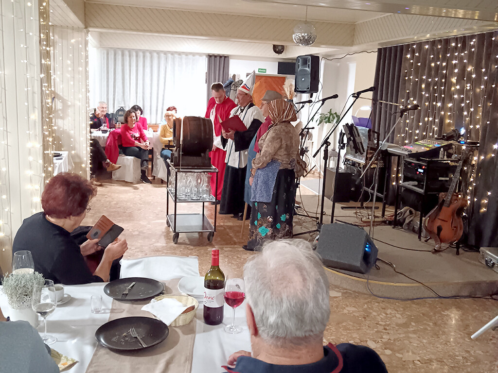 Po dvournem sprehodu po gradu, se seveda prileže tudi kaj pojesti in popiti. V gostilni Janc so nam postregli najprej z aperitivom in ocvirkovko, na jedilniku ni manjkala martinova gos, po krstu mošta pa so nam postregli mlado vino. Ob glasbi so se nekateri člani tudi zavrteli. A kaj, ko je vsega lepega enkrat konec in potrebno se je vrniti domov.