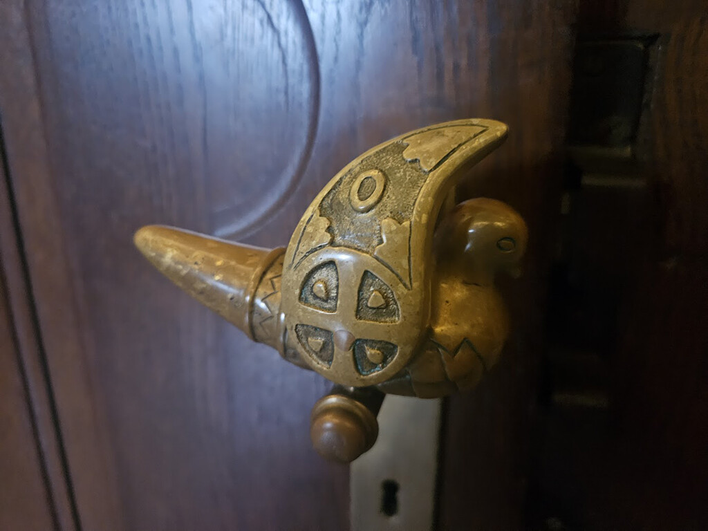 Jože Plečnik je načrt za ureditev Glavnega trga v Kamniku in za preoblikovanje fasad izdelal leta 1953. Glavno fasado stavbe, ki gleda na Maistrovo ulico, odlikuje uporaba tehnike fugirnih kamnov. Pred stavbo je Plečnik načrtoval stebrno lopo, pod njo pa stenski vodnjak. Projekt je dokončal arhitekt Anton Bitenc. Oblikoval je vodnjak z dvema okroglima koritoma in s stebrom, na katerem so prepoznavni elementi Kamnika. Živalska koža simbolizira usnjarsko obrt, zobnik kovinarsko industrijo, nakovalo spominja na kovaštvo, tu pa je tudi znamenita kamniška majolika. Ogled smo nadaljevali s sprehodom proti Šutni.