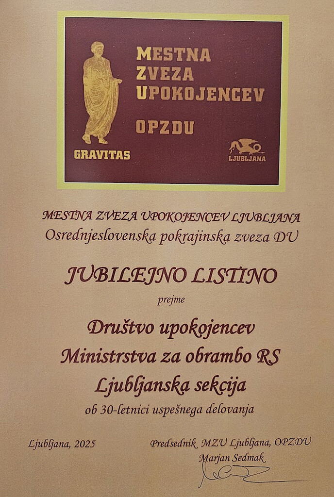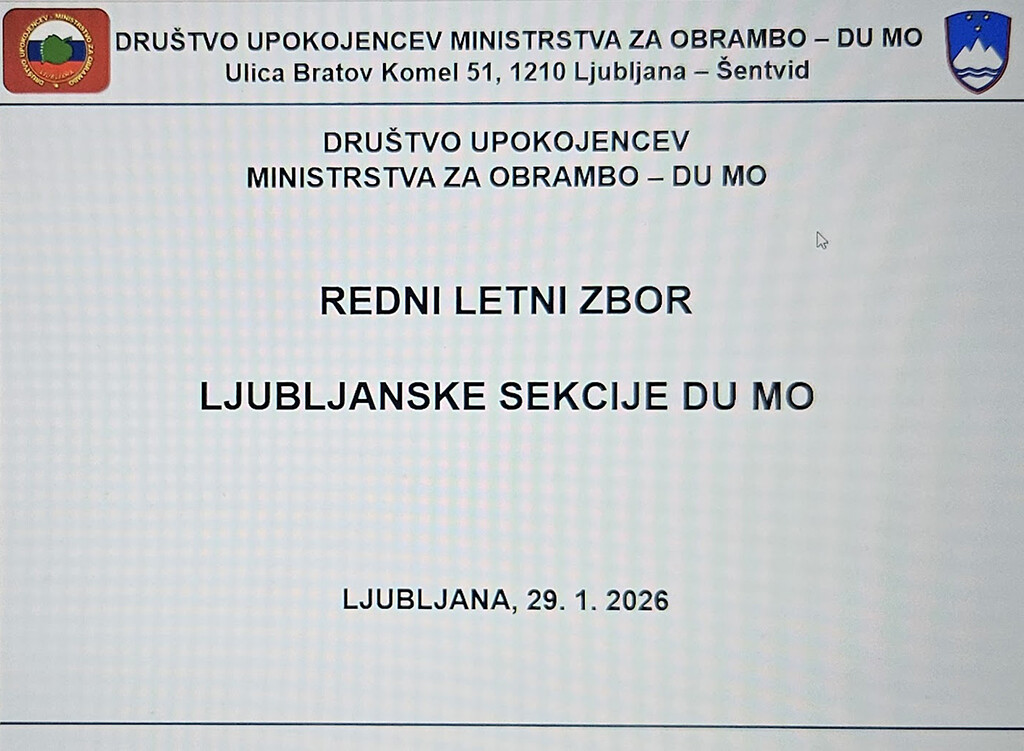 V četrtek, 29. 1. 2026 je v telovadnici vojašnice Edvarda Peperka v Ljubljani, Ljubljanska sekcija DU MO je skladno z letnim načrtom dela organizirala in izvedla Redni letni zbor 2026. Potegnili smo črto pod preteklim letom in se dogovorili kako naprej. Predstavljeno je bilo Poročilo o realizaciji Načrta dela Ljubljanske sekcije DU MO za leto 2025, Finančno poročilo za leto 2025, sprejet pa je bil tudi okviren Načrt aktivnosti za leto 2026. Po opravljenem »uradnem« delu, smo se v jedilnici VEP nekoliko okrepčali in podružili. Pred začetkom aktivnosti je Zbor nagovoril polkovnik Branko Podbrežnik, Poveljnik prostorskih sil SV, ki je v nekaj stavkih predstavil in orisal aktivnosti ter zagotovil, da bo sodelovanje tudi v bodoče vzorno. Nagovoril nas je tudi podpredsednik MZU Ljubljana g. Stanislav Tomšič in pohvalil zgledno sodelovanje Ljubljanske sekcije DU MO z MZU na športnih tekmovanjih, predvsem v kegljanju, ter nas povabil tudi k drugim športnim aktivnostim v okrilju MZU Ljubljana. V imenu Mestne zveze upokojencev, MZU Ljubljana nam je g. Stanislav Tomšič ob 30. letnici uspešnega sodelovanja izročil jubilejno listino. Seveda nam je vse dobro zaželel tudi predsednik DU MO, g. Milan Obreza. Po uvodnih nagovorih smo pričeli z izvedbo Rednega letnega zbora. Najprej smo se z minuto molka poklonili našim članicam in članom, ki so nas zapustili v letu 2025. V letu 2025 nas je zaradi zahrbtnih bolezni za vedno zapustilo šest članic in članov: JURHAR Edvard (89 let), LANDEKER Jožef (78 let), KONJAR Marko (75 let), HAMERŠAK Franc (81 let), TURK Marija (92 let) in TURK Ivan (90 let); Vedno bodo, kakor tudi vsi ostali, ostali v naših mislih. Slava jim! V nadaljevanju je predsednik Ljubljanske sekcije DU MO je podal: Poročilo o delu Ljubljanske sekcije DU MO za 2025; Finančno poročilo za 2025 in Načrta dela za 2026. Poročila in Načrt dela smo soglasno potrdili. V točki Razno smo obravnavali aktualna vprašanja pomembna za članstvo. Vse podrobnosti o posameznih dogodkih lahko dobite na spletni strani DU MO, kjer so vsi dogodki in aktivnosti tudi opisani. Obiskanost spletne strani se po vseh kazalcih povečuje. Vsebino spletne strani določamo sami in samo od naših prispevkov je odvisna njena kvaliteta: DU MO. Kaj od načrtovanega smo realizirali v letu 2025? Kronologija dogodkov v letu 2025: